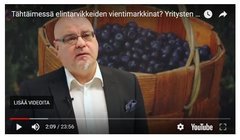 Luonnonvarakeskuksen Arktisuus elintarvikeviennin kärkenä -hankkeen opasvideoilla kuullaan seitsemän elintarvikealan yrityksen vinkit kansainvälistymiseen sekä miten Evira, Food from Finland ja Tulli voivat tukea yrityksiä viennissä. Videolla haastateltu myös luonnontuotealan yrityksiä.