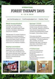 Metsän terveysvaikutusten asiantuntijat kokoontuvat Karjalohjalla elokuussa 6.-12.8.2018. Tapahtuman sisällä 7.8. pidettävä seminaari kokoaa paikalle alan niin suomalaisia kuin kansainvälisiäkin tutkijoita. Päivien aikana saatavilla tietoa esim. oman Green Care -palvelun kehittämiseksi.