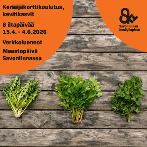 Savonlinnan Kesäyliopisto järjestää yhteistyössä Samiedun kanssa kerääjäkorttikoulutuksen kevätlajeista 15.4. - 4.6.2026. Kerääjäkortti avaa ovia luonnontuotealan työtehtäviin. Kortilla osoitat laadukkaan, turvallisen ja kestävän toimintasi luonnontuotteita myydessäsi tai käyttäessäsi niitä omissa tuotteissasi. Tässä koulutuksessa suoritat kerääjäkortin teoriaosuuden ja saat kortillesi 4–5 kerättävää kevätkasvilajia.