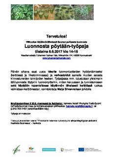 Luonnosta pöytään -työpajan 6.6.2017 klo 14-18 aiheena on villiruokaa käytännönläheisesti Suomen puhtaasta luonnosta. Paikkana Maatilamatkailu Tuhannen Tarinan Talo, Nikkarintie124, 46530 Kannuskoski (www.tuhannentarinantalo.com)